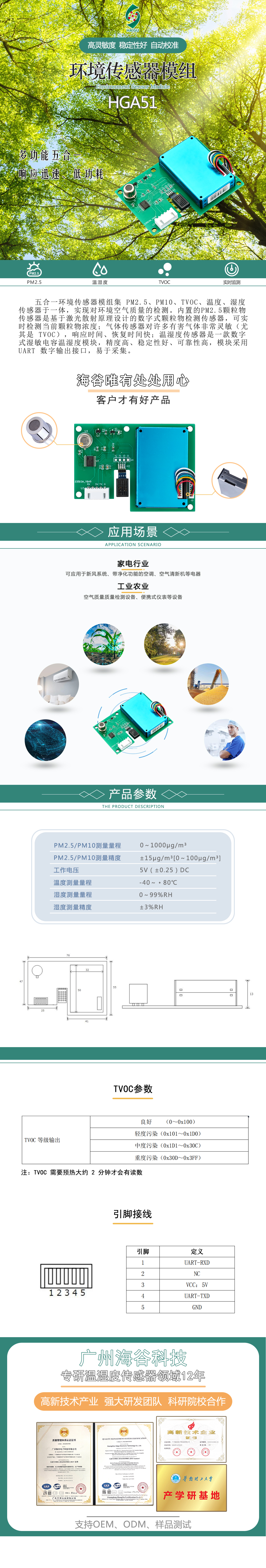 五合一環(huán)境傳感器模組集 PM2.5、PM10、TVOC、溫度、濕度傳感器于一體,實現(xiàn)對環(huán)境空氣質(zhì)量的檢測。