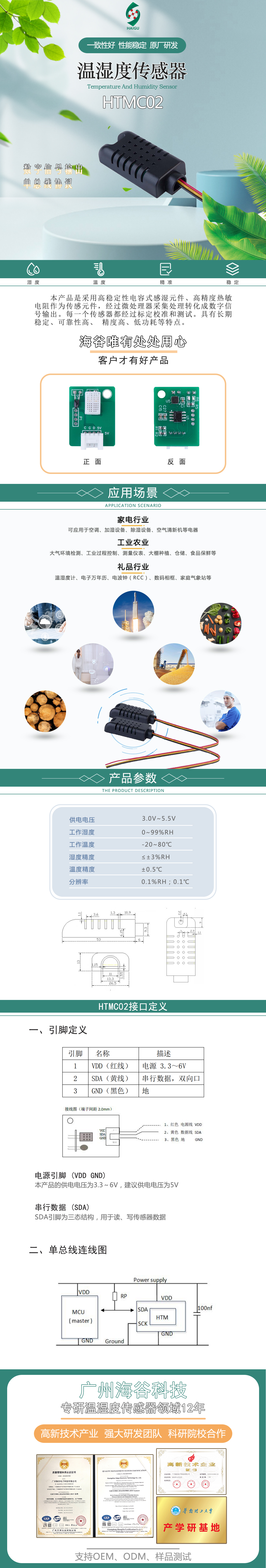 HTMC02是本產(chǎn)品是采用高穩(wěn)定性電容式感濕元件、高精度熱敏電阻作為傳感元件,經(jīng)過微處理 器采集處理轉(zhuǎn)化成數(shù)字信號輸出。每一個(gè)傳感器都經(jīng)過標(biāo)定校準(zhǔn)和測試。具有長期穩(wěn)定、可靠 性高、 精度高、低功耗等特點(diǎn)。本產(chǎn)品是采用高穩(wěn)定性電容式感濕元件、高精度熱敏電阻作為傳感元件,經(jīng)過微處理 器采集處理轉(zhuǎn)化成數(shù)字信號輸出。每一個(gè)傳感器都經(jīng)過標(biāo)定校準(zhǔn)和測試。具有長期穩(wěn)定、可靠 性高、 精度高、低功耗等特點(diǎn)。